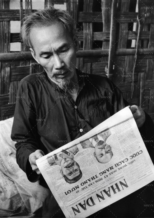 Hình ảnh Bác Hồ ngồi đọc báo trắng đen - File chất lượng cao