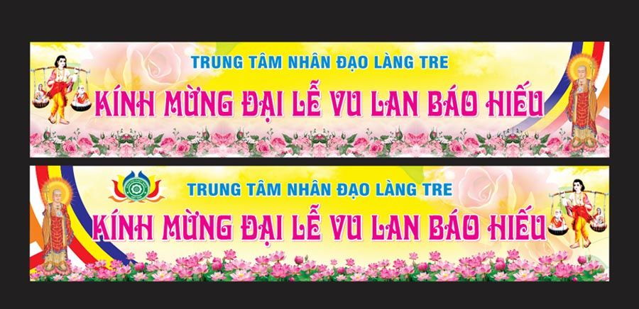 Mẫu băng rôn Vu Lan báo hiếu vector CDR của Trung tâm Nhân đạo Làng Tre, thiết kế rực rỡ với hình ảnh Đức Phật, mẹ hiền gánh con và hoa sen. Dòng chữ “Kính mừng Đại lễ Vu Lan báo hiếu” nổi bật, phù hợp treo tại các cơ sở Phật giáo, trung tâm từ thiện trong mùa Vu Lan.