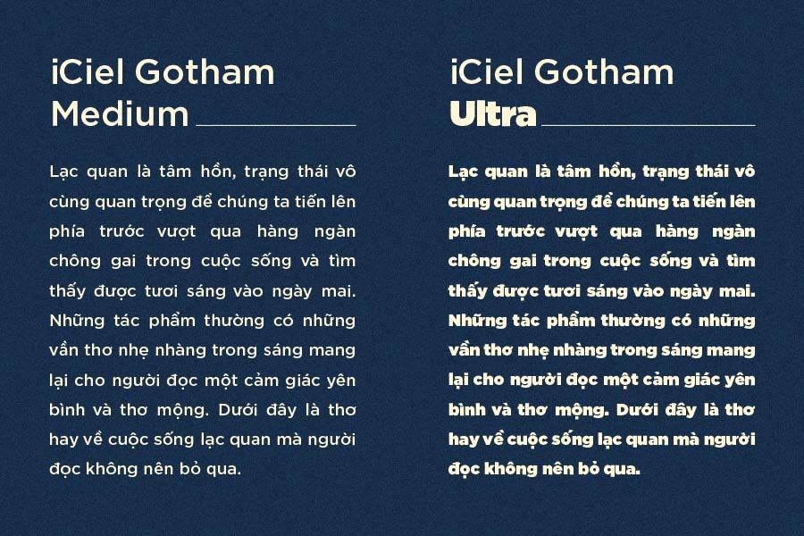 Nhóm iCiel đã Việt hóa bộ font Gotham, giúp font hỗ trợ đầy đủ dấu tiếng Việt. Khác với bản gốc có hơn 60 trọng lượng, phiên bản iCiel tinh gọn chỉ giữ lại 2 kiểu chữ tiêu biểu: