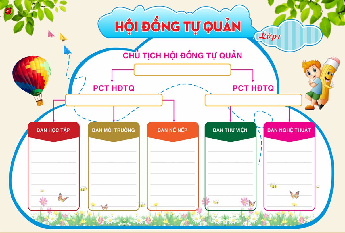 File trang trí hội đồng tự quản học sinh tiểu học, bố cục phân chia rõ ràng các vai trò và hình ảnh minh họa gần gũi với học sinh lớp 1–5.